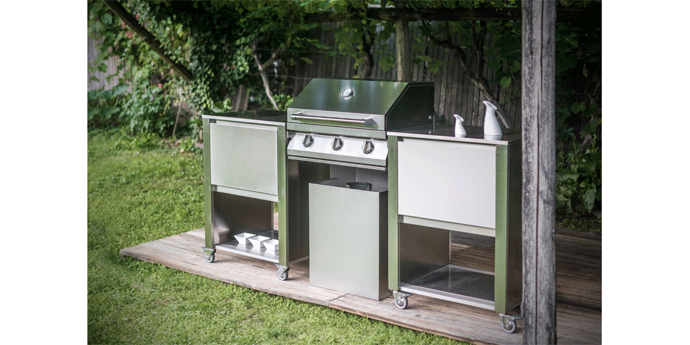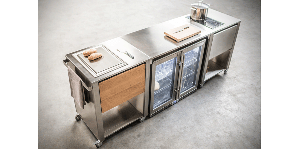 Der Küchenwagen hat links und rechts je ein Stecksystem zur Bestückung von Zubehör oder zum Einhängen einer Verbindungsbrücke.