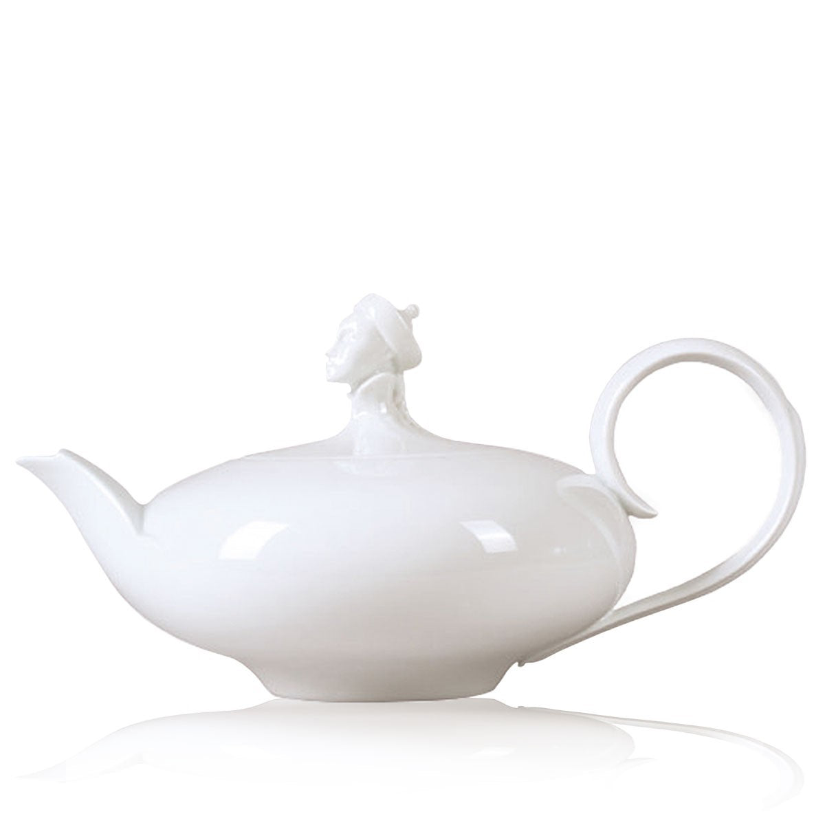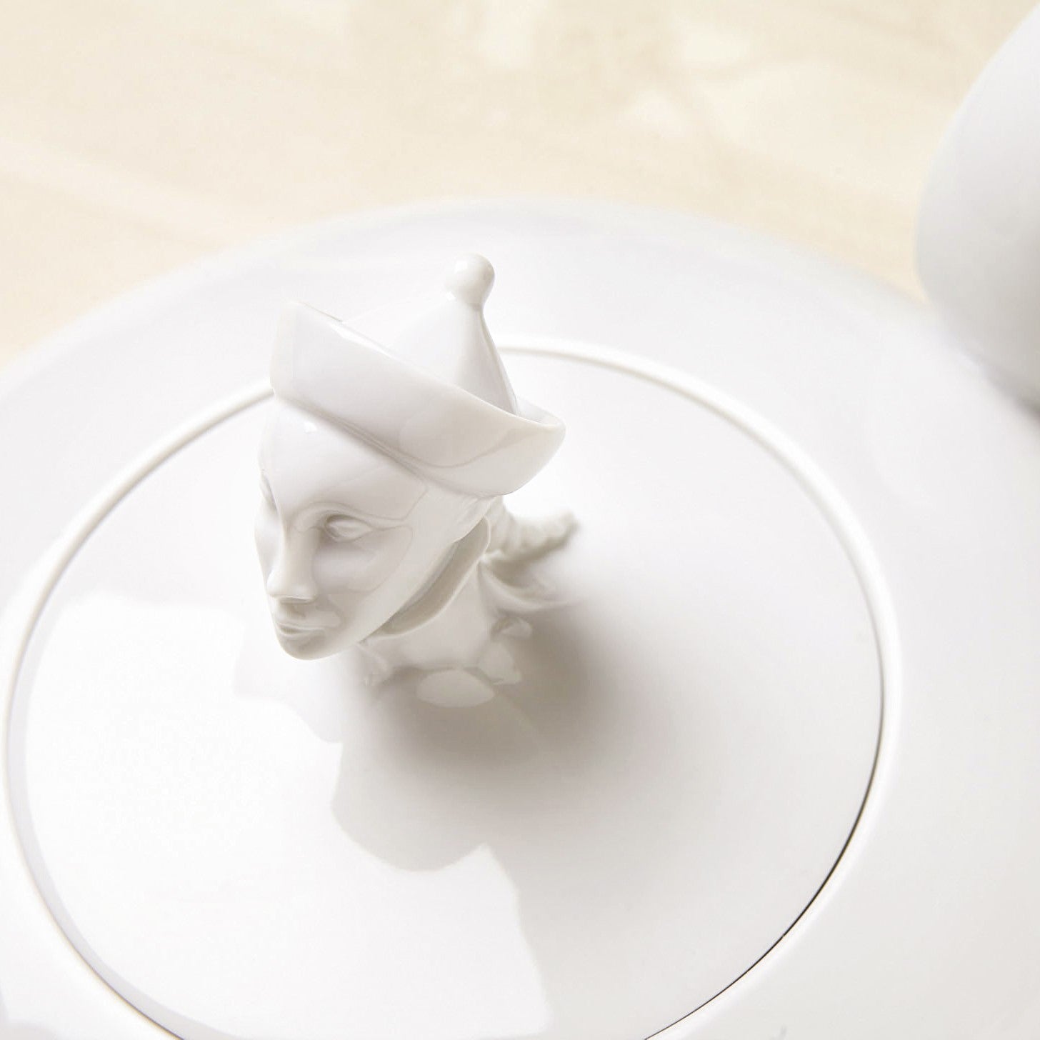 Die geniale Künstlerin Ena Rottenberg entwarf 1930 ein unverwechselbares Service mit schwungvoller Formgebung und orientalischen Elementen. Die schlichte Form des Services in reinem Weiss besitzt eine weiche, bauchige Form und sind geschmückt mit Köpfen unterschiedlicher Nationalitäten. Gerne kann in dieses elegante Service allerhand hineininterpretiert werden: Toleranz, Empathie, Weltoffenheit. Eines ist jedoch sicher: Die elegant anmutig wirkenden Aufsätze sind in ihrer Darstellung und dem Detailreichtum ein zurückhaltendes und doch aussagekräftiges Stilelement.