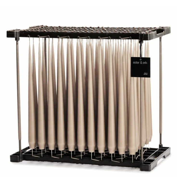 Diese sogenannte Spitzkerze erhält ihre Form durch den natürlichen Wachsverlauf des noch flüssigen Wachses nach dem Herausheben aus dem Wachsbad. Die Kerzen durchgehen 26 Wachstauchgänge bis sie im farbigen Wachsbad ihre endgültige Farbe erhalten.