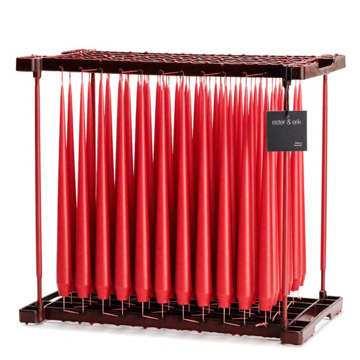 Diese sogenannte Spitzkerze erhält ihre Form durch den natürlichen Wachsverlauf des noch flüssigen Wachses nach dem Herausheben aus dem Wachsbad. Die Kerzen durchgehen 26 Wachstauchgänge bis sie im farbigen Wachsbad ihre endgültige Farbe erhalten.