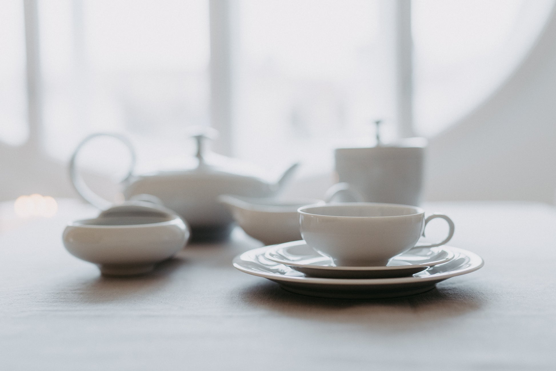 Zur schwungvollen Teekanne sind liebevoll gefertigte Tassen, Milchkännchen und Zuckerdosen erhältlich.